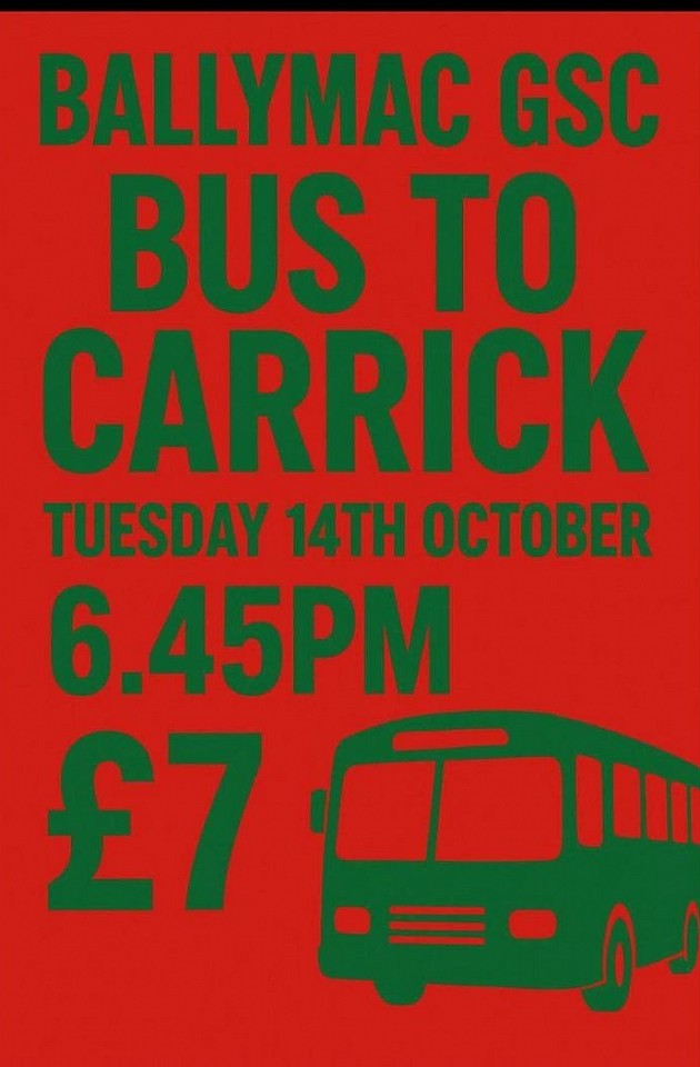 The Ballymacgsc will be running a bus to Carrick Rangers on teusday the 14th of october, leaving the clubrooms at 6.45pm costing £7. Please contact a member to book a seat!