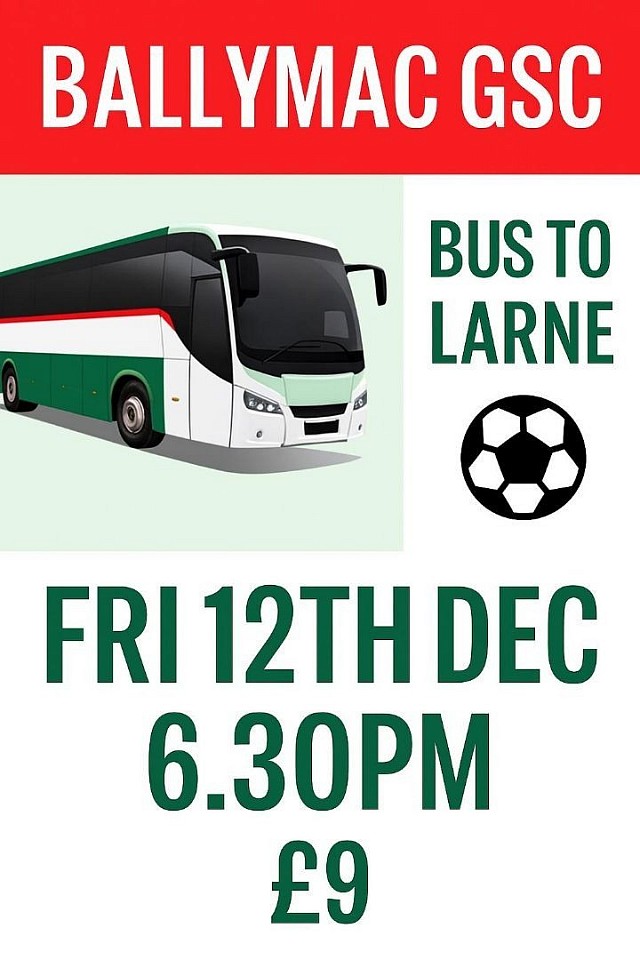 The Ballymacgsc will be running a bus to Larne on friday the 12th of December, leaving the clubrooms at 6.30pm costing £9. Please contact a member to book a seat.